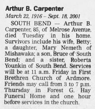 Arthur B. Carpenter, 85, of Melrose Avenue, South Bend, Ind., died Tuesday, Sept. 18, in his residence.