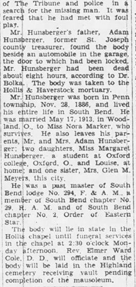 Mr Hunsberger was the son of Mr and Mrs Adam Hunsberger of St Joseph county.