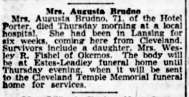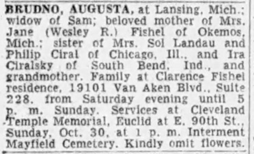 Brudno, Augusta, at Lansing, Mich., widow of Sam, beloved mother of Mrs. Jane (Wesley R.) Fishel of Okemos, Mich., sister of Mrs. Sol Landan and Philies Ciral of Chicago, Ill., and Ira Chalsky of South Bend, Ind., and grandmother.