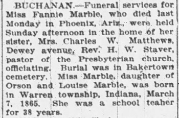FLORENCE "FANNIE" LOUISA10 MARBLE (ORSON OLIVER9, JOSEPH JR.8, JOSEPH7, BENJAMIN6, JOSEPH5, JOSEPH4, JOSEPH3, JOHN2, MARBLE1), daughter of ORSON OLIVER MARBLE and his wife, LOUISA ADAMS HOLMES, was born March 07, 1865 in South Bend, St. Joseph County, Indiana, and died October 25, 1926 in Phoenix, Maricopa County, Arizona.