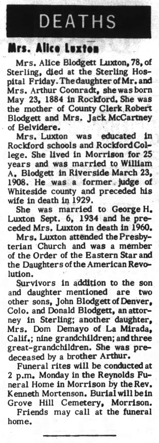 Mrs. Alice Blodgett Luxton, 78, widow of Whiteside County Judge William A. Blodgett and mother of a Sterling attorney and a Boone County official, died Friday in Sterling. She had lived in a Sterling rest home for the past year.